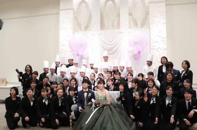 2019年7月、応募カップルの中から鵜川忍様・桃果様が今回の式の主役に決まり、約半年の時間をかけ、当日のプランニングからオープンイングムービーなどの映像制作、当日のサービスまですべて学生の手によって作り上げられました。さらに、本校の美容学科学生はヘアメイクを担当、パティシエ学科はウエディングケーキを担当するなど、学校を上げて結婚式のすべてを作り上げました。