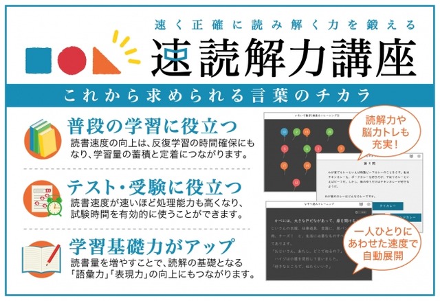 SRJの速読トレーニングは、脳の働きを活用しただれにでも習得可能なトレーニング法で、一人ひとりのスピードに合わせて展開する各コースに取り組むことで、ふだんの学習や受験対策に有効な約3倍の読書スピードを目指します。