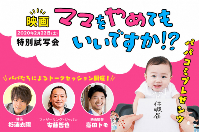 本映画の公開に先駆け、今回特別試写会を実施。さらに映画上映後に特別ゲスト3名によるトークセッションを開催します。ゲストには、現在4児の父親であり、育児や家庭生活のサポートにも積極的に取り組む俳優・杉浦太陽氏、そして「Fathering=父親であることを楽しむ」を合言葉として活動するNPO法人 ファザーリング・ジャパン代表・安藤哲也氏、さらにドキュメンタリー映画『うまれる』シリーズを生み出し、本映画を監督した豪田トモ氏の3名によるトークセッションを実施します。当日は、皆さまに「夫婦のパートナーシップ」をテーマにお話頂く予定です。