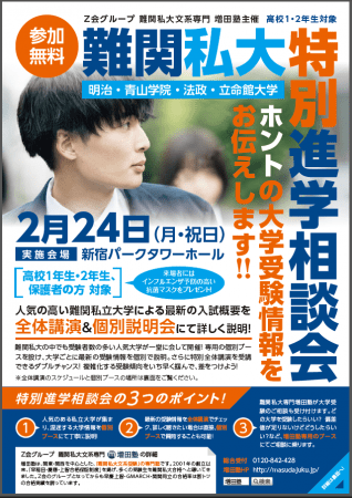 株式会社増進会ホールディングス(Z会グループ)のグループ会社、株式会社増田塾(本社:静岡県三島市、代表取締役社長:下田 勝昭)は、来春行われる2021年度大学入試に関する講演イベント「難関私大 特別進学相談会」を、2020年2月24日(月・祝)に新宿パークタワーホールにて開催します。一般入試志願者数トップ15(※)に入る人気難関私立大学(青山学院大学・明治大学・法政大学・立命館大学)が一堂に会し、各大学が全体講演と個別相談会を行うイベントで、今回が初開催です。