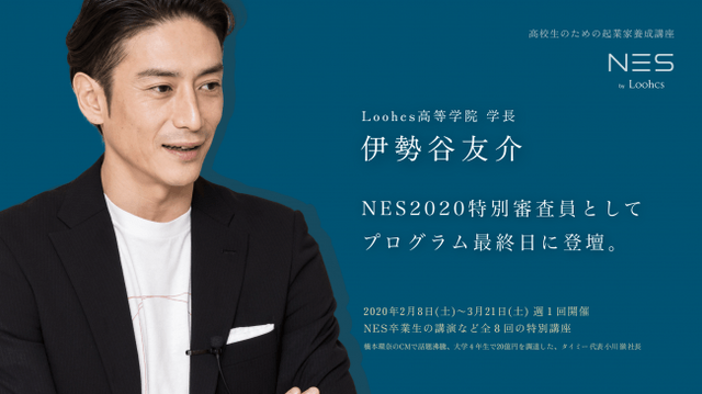 Loohcs株式会社(代表取締役 : 斎木陽平 本社所在地 : 渋谷区代々木)は、今年で8年目を迎える「高校生のための起業家養成講座 NES2020 by Loohcs」を2020年2月15日(土)~3月21日(土)まで実施致します。その講座で伊勢谷友介が特別審査員に決定しました!