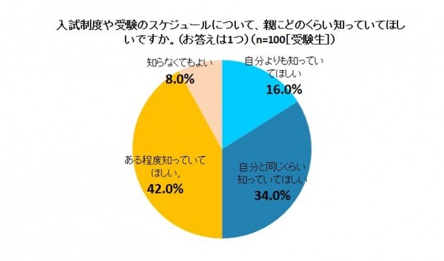 受験生に入試制度や受験のスケジュールについて、親にどの程度知っておいてほしいかを尋ねたところ、半数が「自分と同じくらいもしくはそれ以上に知っていてほしい(50.0%)」(「自分よりも知ってほしい(16.0%)」「自分と同じくらい知っていてほしい(34.0%)」の合算)と考えていることが分かりました。さらに、「ある程度知っていてほしい」と答えた人まで合算すると、92.0%と約9割にものぼる受験生が親に「入試制度や受験のスケジュールについて」の知識を求めているということが明らかになりました。