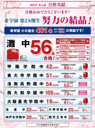 株式会社 希(のぞみ)学園(関西本社:大阪市北区 理事長 前田卓郎・学園長 黒田耕平/以下「希学園」)では、2020年 近畿圏中学受験 春入試において、塾生たちが多くの最難関校、難関校で合格を勝ち取ってくれましたので、ご報告いたします。