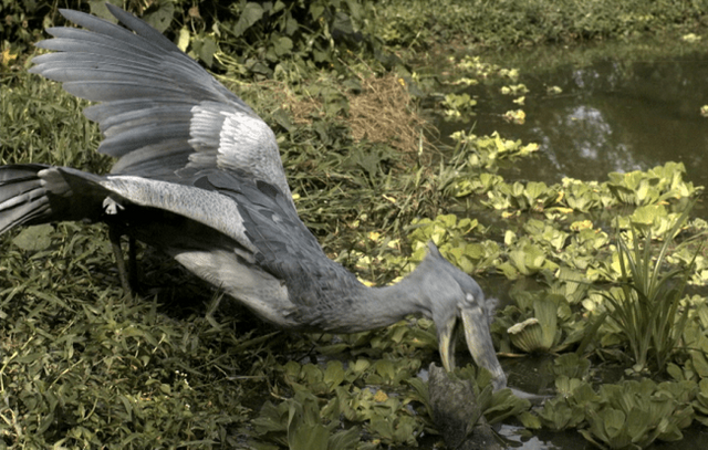 ハシビロコウが好むマンバという魚は、ふつうの魚とちがって肺を使って呼吸する「ハイギョ」とよばれる魚です。そのため、数時間に一度、息つぎをする必要があります。そのとき、すいこんだ空気の一部がもれ、泡となって水面にうかびます。マンバはせまい範囲でしか行動しないため、泡が見えた場所の近くで息つぎをします。ハシビロコウはその瞬間をねらい、おどろくほどのスピードでマンバをとらえるのです。