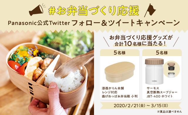 2020年2月21日(金)~3月15日(日)の期間中、パナソニック公式Twitterアカウント「@Panasonic_cp」をフォローし、キャンペーン投稿からハッシュタグ「#お弁当づくりの悩み」をつけてお弁当作りの悩みをツイート!当選された方には後日DMが届きます♪