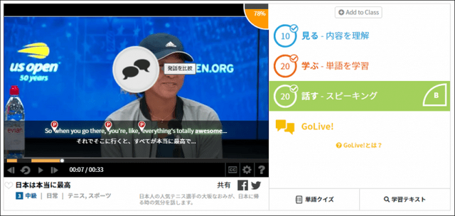 『EnglishCentral』は、英語学習の基本である「聞く」「読む」「話す」が効果的に学習できるよう、教育学、脳科学、音声科学など最先端の研究をもとにGoogle社の投資子会社であるGoogle Ventures社の投資を受けて、アメリカで開発されたサービスです。1万4000本を超える動画コンテンツとオンライン英会話を組み合わせた数少ない総合英語学習サービスで、グーグルのグループ会社として培った技術と音声認識テクノロジーによる発音診断により日本人が苦手意識を持つ発音練習を効果的に行うことができます。また、これらの自己学習の成果を、「GoLive!」というオンライン英会話レッスンを通じて、さらに磨くことも可能です。日本国内では、現在全国200以上の大学、中学校、高等学校で利用されており、ユーザー数は世界中で500万人以上。2017年から高校検定教科書デジタル教材としても日本全国で利用が開始されているほか、2018年からは学習管理システム(LMS)の「Classi」および「まなびポケット」の公式英語学習コンテンツとしての利用が始まっています。