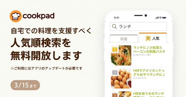 クックパッドは、このような状況下でも前向きな気持ちで過ごせる人を一人でも多く増やすために、プレミアムサービス会員向け機能のひとつである「人気順検索」の3月15日までの無料提供をはじめ、様々な支援を開始します。