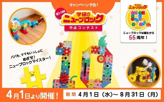 今回10回目の開催となる学研のニューブロック作品コンテストでは、応募作品の中から毎月5名の優秀作品を選定します。優秀作品に選ばれた方には「ニューブロックマイスター認定証」と「作品BOOK」、さらに今回は特別プレゼントとしてお子さまや作品の写真と名前を入れた世界に一つだけのオリジナルパッケージのニューブロックをプレゼント致します。(大人の方のご応募も可能です)また、Wチャンスとして、期間中最も優れた作品を制作したマイスターには、最優秀作品賞として豪華賞品を1名様に進呈します。
