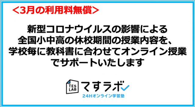 オンライン学習塾「てすラボ」(https://test-labo.jp/)を運営する株式会社エンライク(所在地:大阪市北区梅田、代表取締役:後藤智則)は、2月27日に発表された全国小中高の臨時休校に際し、3月の利用料を全ての生徒に無償で提供します。