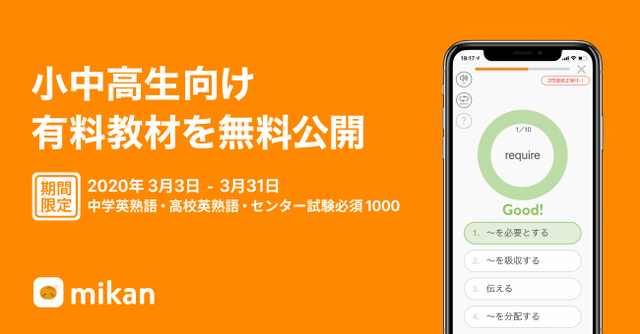 英単語アプリmikanの開発・運営を行う株式会社mikan(本社:東京都渋谷区、代表取締役:高岡和正)は、新型コロナウイルスの影響による休校措置を受け、全ての小中高生に向けまして、mikan PRO(有料)にて提供している一部教材を無料公開いたします。