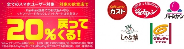 本キャンペーン開催期間中に、対象の店舗・箇所においてPayPay残高で支払うと、20%のPayPayボーナスを付与します(ヤフーカード含め、クレジットカードでの支払いは対象外)。また、「Yahoo!プレミアム会員」のユーザーは、25%のPayPayボーナスが付与されます(※1)。