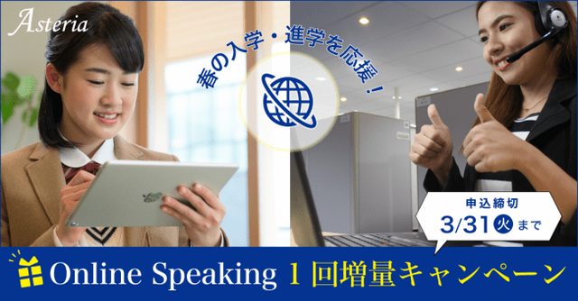 iPadをフル活用するオンライン講座Z会Asteria「英語4技能講座」では、2020年3月2日~3月31日までの期間限定の新入会キャンペーン、【Online Speaking1回増量キャンペーン】を実施しています。
