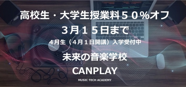 AIで音楽制作やヒット分析など音楽領域でのAI、機械学習、データサイエンス、Pythonプログラミングを学べる未来の音楽学校CANPLAYが、高校生・大学生(25歳以下の専業学生。大学院生含む)の授業料を3月15日まで50%オフ、半額で入学できるキャンペーンを行います。
