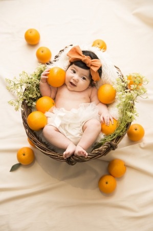 オレンジの意味は「純粋」。まんまるオレンジとお揃いのリボンで可愛くコーディネート。純粋なあかちゃんらしい仕草や表情も逃しません!