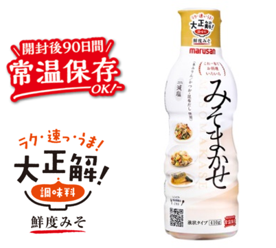 新商品「これ一本でお料理いろいろ みそまかせ410g」は、毎日忙しく働くお母さんたちの声から生まれました。これ一本で、味付けが決まる。定番料理がいつもと違う一品へ。いろいろな料理に使えるように、「みそ」「甘味」「塩味」「だし感」のバランスにとことんこだわった、「鮮度みそ」シリーズ初のお料理専用液状みそ調味料です。今までになかった便利さと美味しさで、仕事も家事もがんばりたいお母さんたちを応援します。