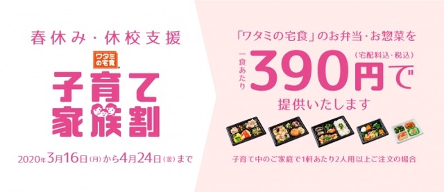 そこで、今までにない緊急プランとして、子育て中のご家庭で、2食以上お弁当をご注文の場合、1食あたり390円の”子育て家族割“を開始することに致しました。春休みや休校時のお食事準備に関わるご負担の軽減に、