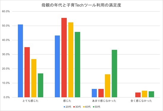質問の中で子育てにまつわるテクノロジーを活用したアプリなどのツール類に対する満足度を聞くと母親が低いほど満足度が高い傾向にあった。母親の年齢が低いほど柔軟に新しいツールやサービスを取り入れて、便利に使いこなしていることがわかる結果となった。