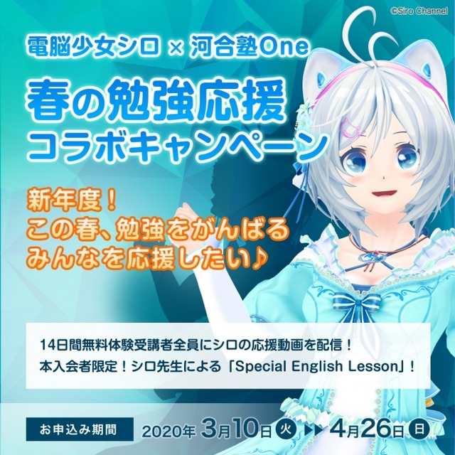 今回のキャンペーンでは、『電脳少女シロ』を河合塾Oneのアンバサダーに起用し、電脳少女シロによる応援メッセージ動画やスペシャルレッスンなど、さまざまな企画を用意し、春から気持ちを新たに勉強に取り組む高校生を応援します。