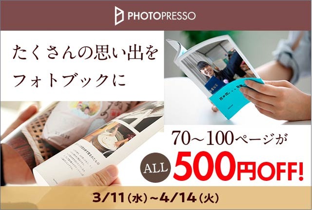 70ページ~100ページのフォトブック を期間限定で500円引きで注文できます。