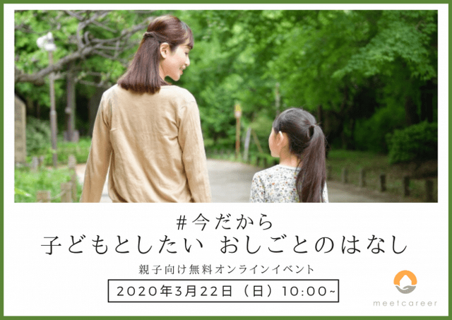 株式会社fruor(所在地:東京都港区、代表取締役 CEO:喜多村 若菜)が運営する、自分に合った働き方を見つけるためのキャリア支援サービス「meetcareer(ミートキャリア)」では、新型コロナウィルス対策や学校休校による在宅勤務で親の働く姿を子どもが見る機会が増えていること、外出を控え親子で家で過ごす時間が増えていることを受け、2020年3月22日(日)10:00~10:45、親子で自宅から参加できる無料オンラインイベント「#今だから 子どもとしたい おしごとのはなし」を開催します。