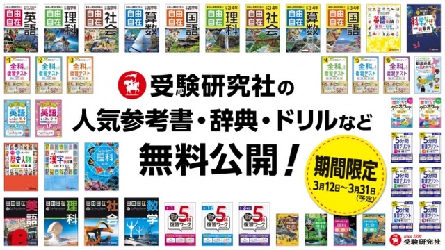 教育出版社 株式会社増進堂・受験研究社(本社:大阪市西区、代表取締役:岡本明剛)は、休校要請等により自宅学習に取り組んでいる小・中学生を応援するため、創刊以来2600万部突破のベストセラー参考書「自由自在」をはじめ、学年の復習が一冊でできる人気の問題集「全科の復習テスト」など、自宅学習に適した参考書・辞書・ドリル・問題集など約40冊を受験研究社Virtual Libraryにて期間限定で無料公開します。この取り組みは、当社が賛同企業と共同で取り組む“LEARN at HOMEプロジェクト”の一環となります。
