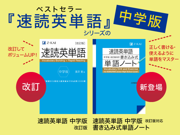 株式会社増進会ホールディングス(Z会グループ)のグループ会社、株式会社Z会ソリューションズは、『速読英単語 中学版 [改訂版]』を2020年3月12日に発刊。さらに『速読英単語 中学版 [改訂版]対応 書き込み式 単語ノート』を新しく2020年3月17日に発刊いたします。
