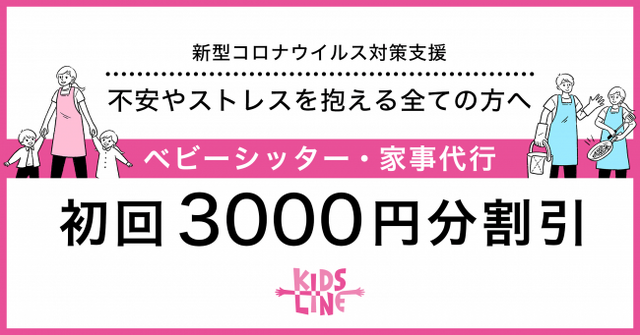 こうした状況を受け、入会金年会費なしで、ベビーシッターや家事代行をスマホで1時間1000円~(手数料別)で24時間・即日手配できるキッズラインでは、このような状況に不安やストレスを抱えるすべての方に少しでもお役に立ちたいと、ベビーシッター・キッズシッター・家庭教師などお子さまのお世話や、家事代行全般(子育て世代だけではなく、単身世帯の方にも)で、初回3000円分の割引を行う支援策を実施いたします。