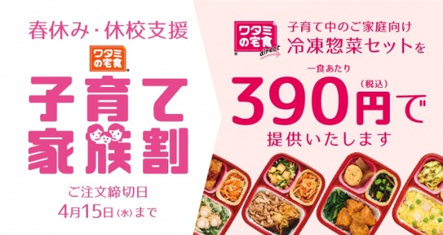 ワタミ株式会社(本社:東京都大田区)は、日替わり夕食宅配を行う「ワタミの宅食」にて、新型コロナウィルスの感染防止策として休校措置が取られる中、小中高生を対象に「臨時休校支援(商品代金無料)」を実施し、支援枠上限の約50万食分をもって受付を終了しました。「ワタミの宅食(冷蔵のお弁当)」サービスエリア外のお客様からも想定を上回るご要望・お問合せがありました。このような状況から、“冷凍惣菜”を全国へお届けできるプランを新たに追加いたしました。子育て中のご家庭向けに、1食あたり390円の【子育て家族割】価格で“冷凍惣菜”をお届けします。休校、春休み期間、また新年度の繁忙期に、ご家族のお食事準備に関わるご負担の軽減に「ワタミの宅食」でお手伝いさせていただきたいと考えております。健康に配慮し栄養バランスを考えたお弁当をご自宅までお届けするという、社会インフラ事業として、可能な限り社会に貢献してまいります。