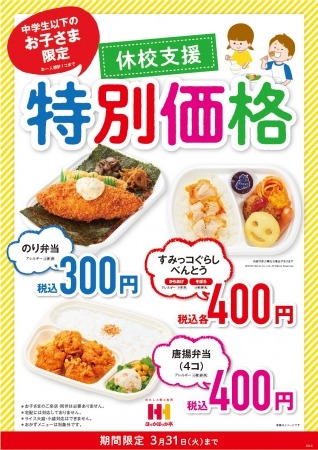 新型コロナウイルス感染症防止による臨時休校措置を受け、「ほっかほっか亭」では、ご家庭でのお食事支援として、「のり弁当」・「唐揚弁当」・「すみっコぐらしべんとう」の3品を「特別価格」で販売することと致しましたので、ご案内致します。