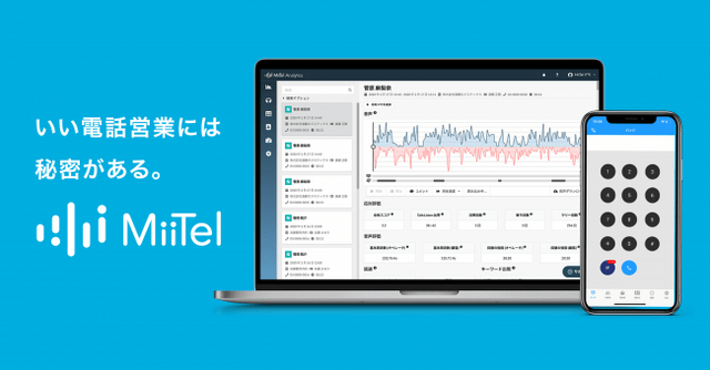 通話内容を可視化するクラウドIP電話です。MiiTelは電話営業や顧客対応を録音解析、スコアリングし、「担当者が何をどのように話したか分からない」「成約失注の理由が分からない」といった電話業務における『ブラックボックス問題』を解消します。MiiTelを導入することで、通話における会話速度や顧客との会話のラリー回数、会話の被せ率等可視化されるほか、自動での議事録作成が行われる結果、担当者自らが会話を振り返るようになり成約率が上がり、解約率や教育コストが低減するほか、従来の固定電話機が不要となるため、通信料やハードウェアコストの削減にも寄与します。