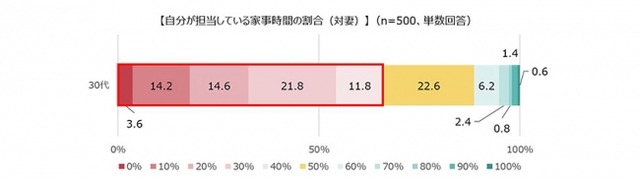 一方で、平日の家事分担は、自分3割:妻7割が最多。6割以上が妻の負担の方が大きいと回答