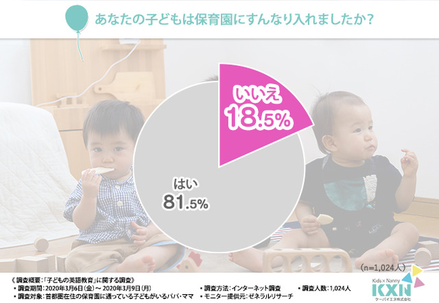 「あなたの子どもは保育園にすんなり入れましたか?」と質問したところ、約2割の方が『いいえ(18.5%)』と回答しました。