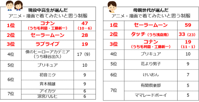 親世代では、「セーラームーン」が1位に。2位は「タッチ(朝倉南)」、3位は「プリキュア」という結果になりました。現役中高生世代でも、「セーラームーン」は2位に。1位は「コナン」、3位は「プリキュア」「ラブライブ」がランクインしました。現在、放送されていないセーラームーンが両世代共に1位となり根強い人気が伺える結果となりました。