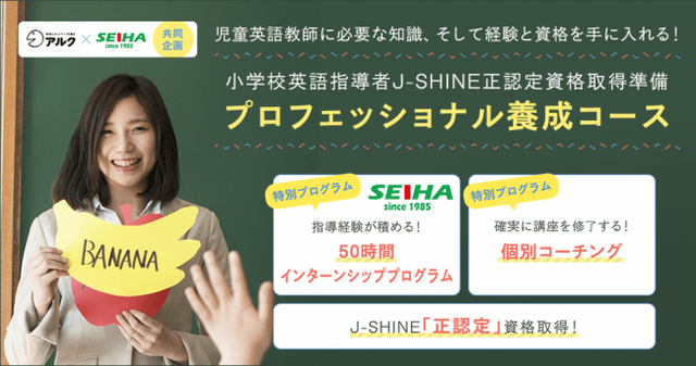 「小学校英語指導者J-SHINE正認定 資格取得準備 プロフェッショナル養成コース」では、子どもに英語を教えるための「知識」と「スキル」をアルクの通信講座で、「50時間の指導経験」をセイハネットワークが運営する教室で得ることができます。