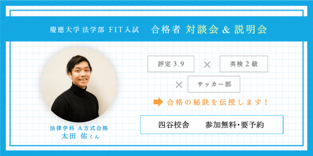 FIT入試とは慶應義塾大学法学部が行っているAO入試を指し、定員は160名と私立大学推薦入試の中でも最も多い入試形態の一つです。そのため毎年高倍率を記録し、A方式に課される書類は準備しなければならないことがとても多いため、早い時期からの対策が肝心となります。また、低倍率と言われるB方式では地域ブロック別での募集となります。そのため南関東ブロックは一都三県に加え海外就学者も含めることから、高い倍率であると予想されています。このように難関と評される慶應義塾大学法学部のFIT入試ですが、実はある条件を持つ受験生にとっては大変有利になる入試形態でもあります。