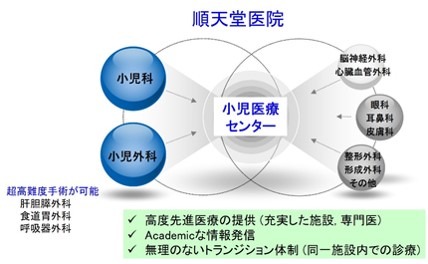 子ども達やそのご家族の皆さんのご不便・ご心配を解消するため、順天堂医院では小児医療センターをスタートしました。同センターは、小児科・小児外科を中心に、各診療科の横のつながりを重視したシームレスな診療体制を構築しています。