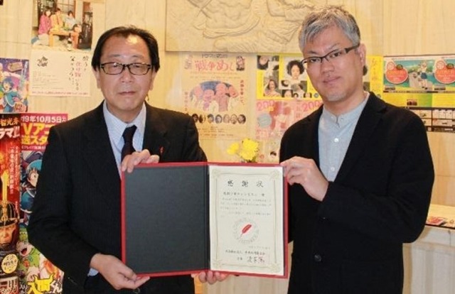 中央共同募金会事務局長 阿部陽一郎氏(左)から、感謝状を受けとる週刊少年チャンピオン編集部編集長 武川新吾(右)