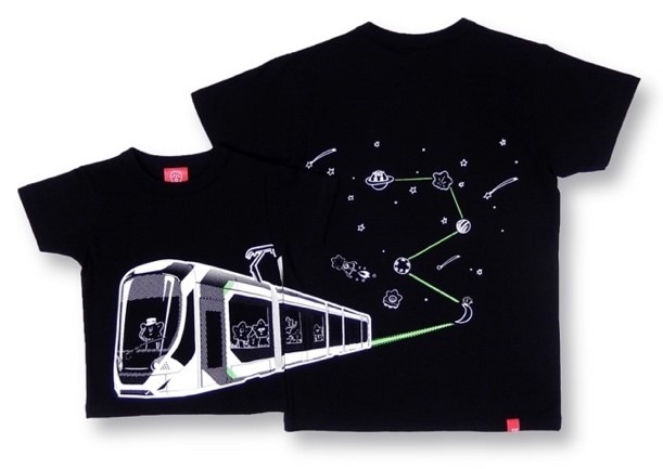 フロントからバックにかけて広島電鉄の車両が描かれており、2人で並ぶと前と後ろで電車の柄を繋げて見せることができます。