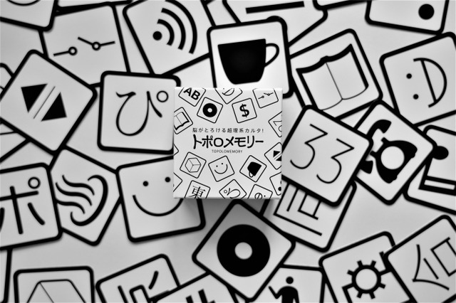 『トポロメモリー』は、図形や記号が描かれたカードの中から、トポロジー的に同じ形のペアを見つけていち早く取るという、カルタと神経衰弱を足したシンプルなルールのボードゲームです。