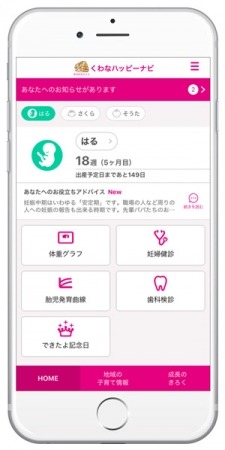 桑名市に採用された『くわなハッピーナビ』は、スマートフォン・タブレット端末・PCに対応したサービスで、妊産婦と子どもの健康データの記録・管理や予防接種のスケジュール管理、出産・育児に関するアドバイスの提供など、育児や仕事に忙しい母親や父親を助けてくれる便利な機能が充実しています。