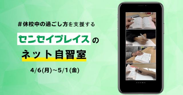 教育変革をミッションに掲げ“独学にコーチをつけることで、勉強法が劇的に変わる”「オンライン独学コーチング」サービスを提供するセンセイプレイス株式会社は、新型コロナウイルス感染拡大防止に伴う都立高校の休校期間延長の発表を受け、4月6日(月)から5月1日(金)の期間中、3月に実施しましたネット自習室企画を再開することをお知らせいたします。