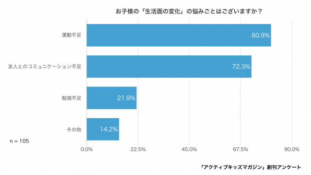 アンケートを取らせていただいて感じたことは、「生活面の変化」では、運動不足への不安が 80.9%、友人とのコミュニケーション不足が 72.3%と高い数字となっていることから、身体を動かせず、コミュニケーションへの不安を抱える親御さんが多いことが明らかになりました。