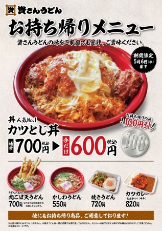 お持ち帰り販売の増加やご自宅や職場等でのお食事の需要の高まりを受け、より気軽に「資さんうどん」のお持ち帰り商品をご利用頂けるよう、丼メニューの中で人気No.1の「カツとじ丼」(700円)を、お持ち帰りのみ4月8日(水)~5月6日(水)までの期間限定で、100円引きの600円(税込)にてご提供します(みそ汁はついておりません)。この機会にぜひ、丼人気No.1「カツとじ丼」をご家庭や職場等でもお楽しみください!!