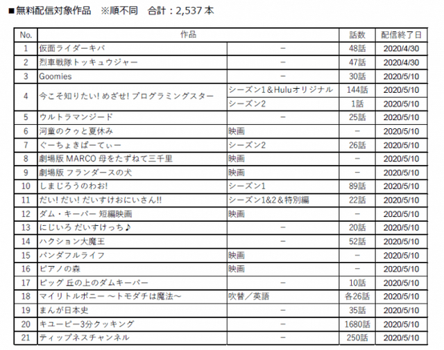 HJホールディングス株式会社(本社:東京都港区、代表取締役社長:於保 浩之)が運営するオンライン動画配信サービスHuluは、新型コロナウィルス感染拡大防止のための緊急事態宣言発令に伴い、在宅支援第2弾として、キッズ・知育、料理、エクササイズコンテンツ等2500本以上を4月8日(水)から5月10日(日)※まで無料配信します。