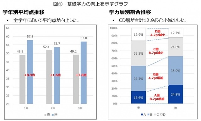 ・図1.のABCD層のうち、2019年に行った春と秋の2回の到達度テストにおいて、総合点数が1点以上上がった生徒に対して分析を行っています。