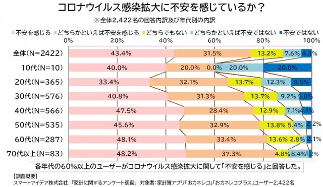 430万DL突破のカンタン家計簿アプリ「おカネレコ」を提供するスマートアイデア株式会社(本社:東京都中央区、代表取締役:江尻 尚平、以下「当社」)は、新型コロナウイルス感染拡大の影響を受け、当社サービスユーザーのお金の使い方に関する意識変化・実態を把握するため、2,422名に対して「家計に関する意識調査」を実施しましたので、ご報告します。