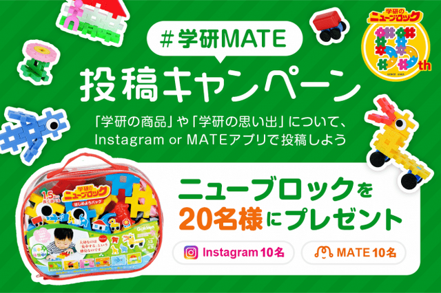 株式会社学研ホールディングス(東京・品川/代表取締役社長:宮原博昭)のグループ会社、文具や知育玩具のメーカーである株式会社学研ステイフル(東京・品川/代表取締役社長:福本高宏)は、学研のニューブロックの発売55周年を記念して、Webメディア “わたしの節約(MATE)" とのコラボ企画にて、SNS投稿キャンペーンを開催中です。抽選で『学研のニューブロック はじめようバッグ』が20名様に当たります。
