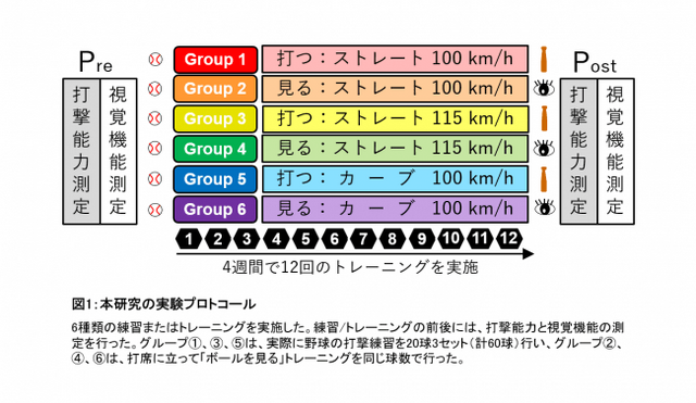 実験は、6つのグループで行い、<1>ストレート(直球)100km/hを打撃練習するグループ、<2>打席に立ってそのボールを見るグループ、<3>ストレート115km/hを打撃するグループ、<4>見るグループ、<5>カーブボール100km/hを打撃するグループ、<6>見るグループとしました(図1)。見るグループについては、ボールを見た後にスイングを行い、スイング練習自体の影響は各グループで統一しました。また、練習/トレーニングの前後には、打撃能力測定と、動体視力、深視力、眼と手の協応に関する視覚機能*1の測定を行いました。打撃能力測定については、ストレート100km/h、115km/h、カーブ100km/hの3種類の条件で各20球実施しました。打撃結果を1球ずつ5段階で評価して合計し、各条件での得点としました。