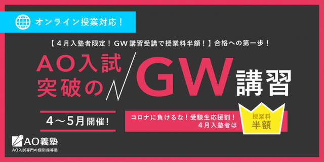 GWでしっかりと対策をしないと次の大型連休は夏休みのみ・・・。この連休をいかに過ごすかが、AO入試の合否をわけると言っても過言ではありません。GWを無駄にせず、周りと差をつけましょう!