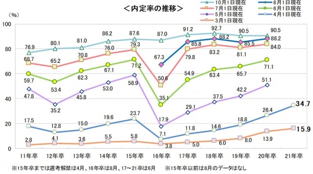 ○内定率は34.7%。前年同期実績(26.4%)を8.3ポイント上回る